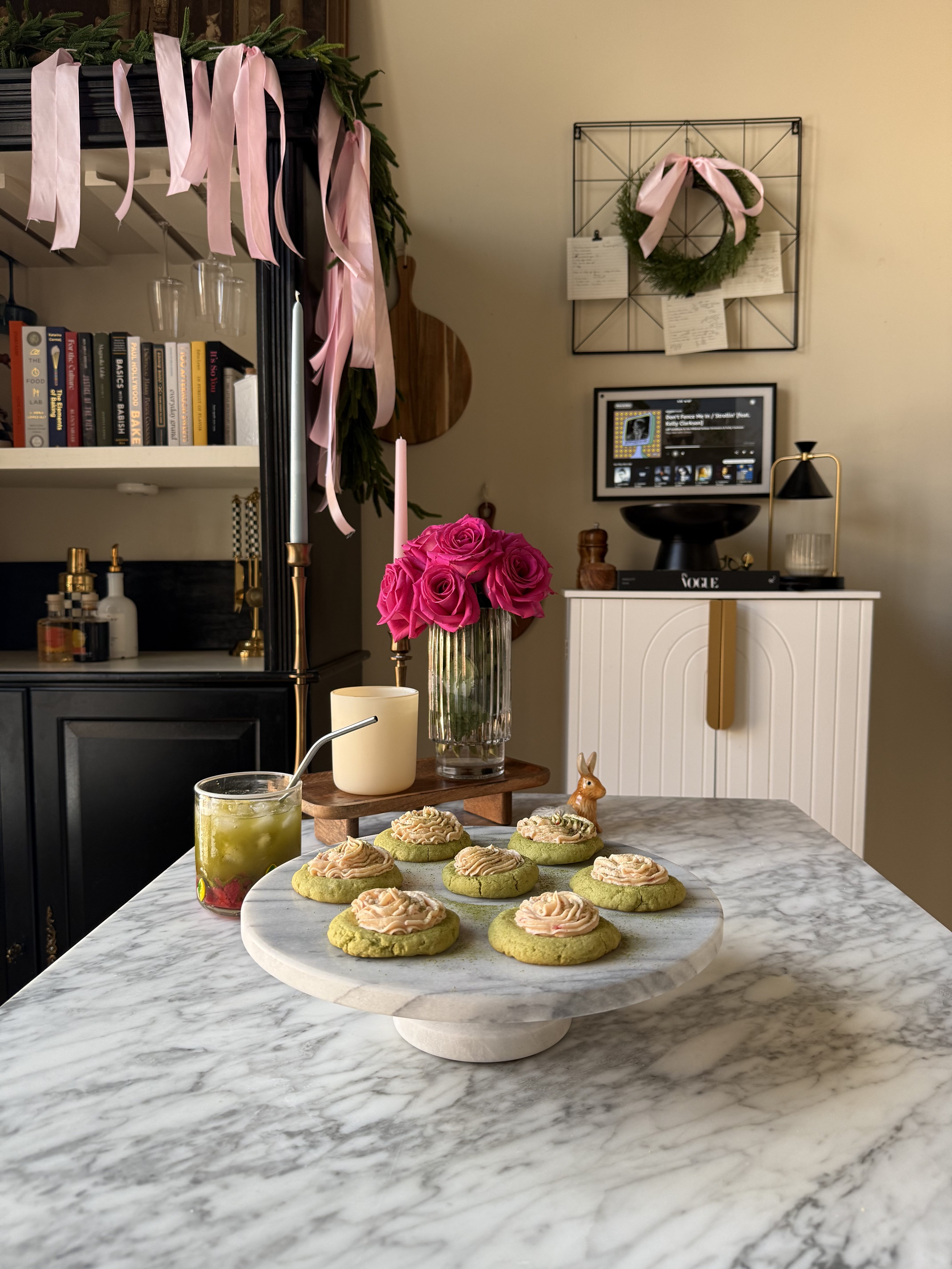 - Allow the cookies to cool before frosting them with the strawberry buttercream and a sprinkle of matcha powder.