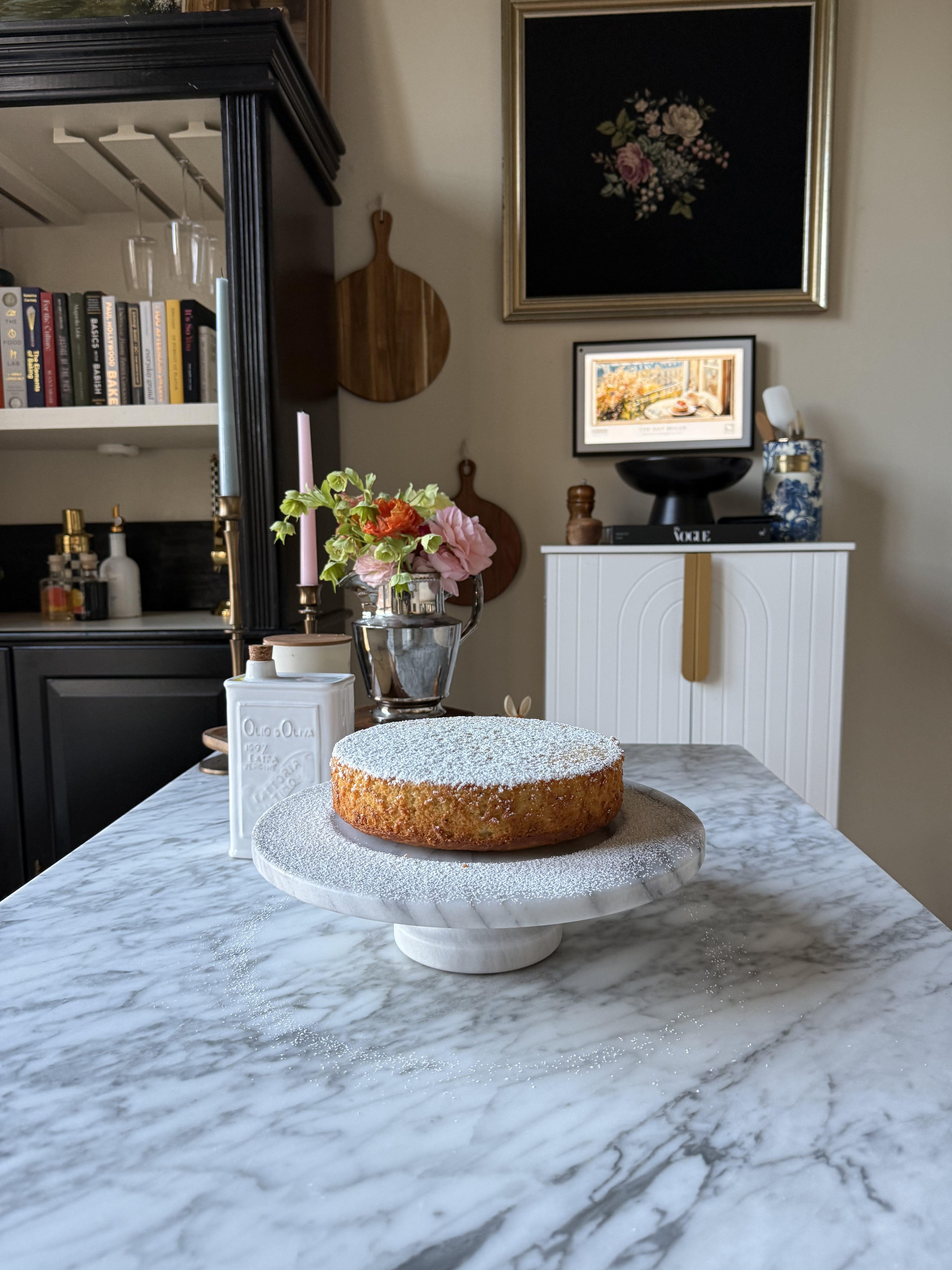 - Once baked, allow the cake to cool before topping it with powdered sugar.